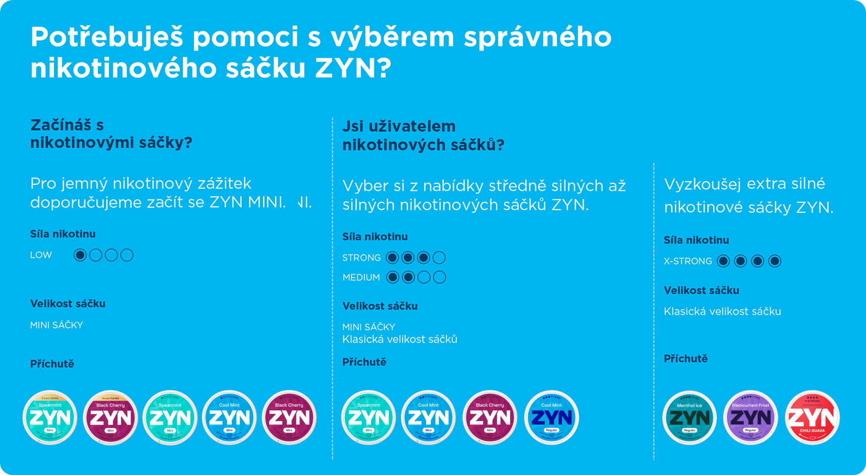 Nikotinové sáčky ZYN nabízejí moderní způsob jak si vychutnat nikotinový zážitek bez kouře a bez obsahu tabáku. Nikotinové sáčky ZYN jsou tu pro Tebe v různé síle a velikosti. Vyber si ideální formát svého nikotinového zážitku a objednej pohodlně online až domů.