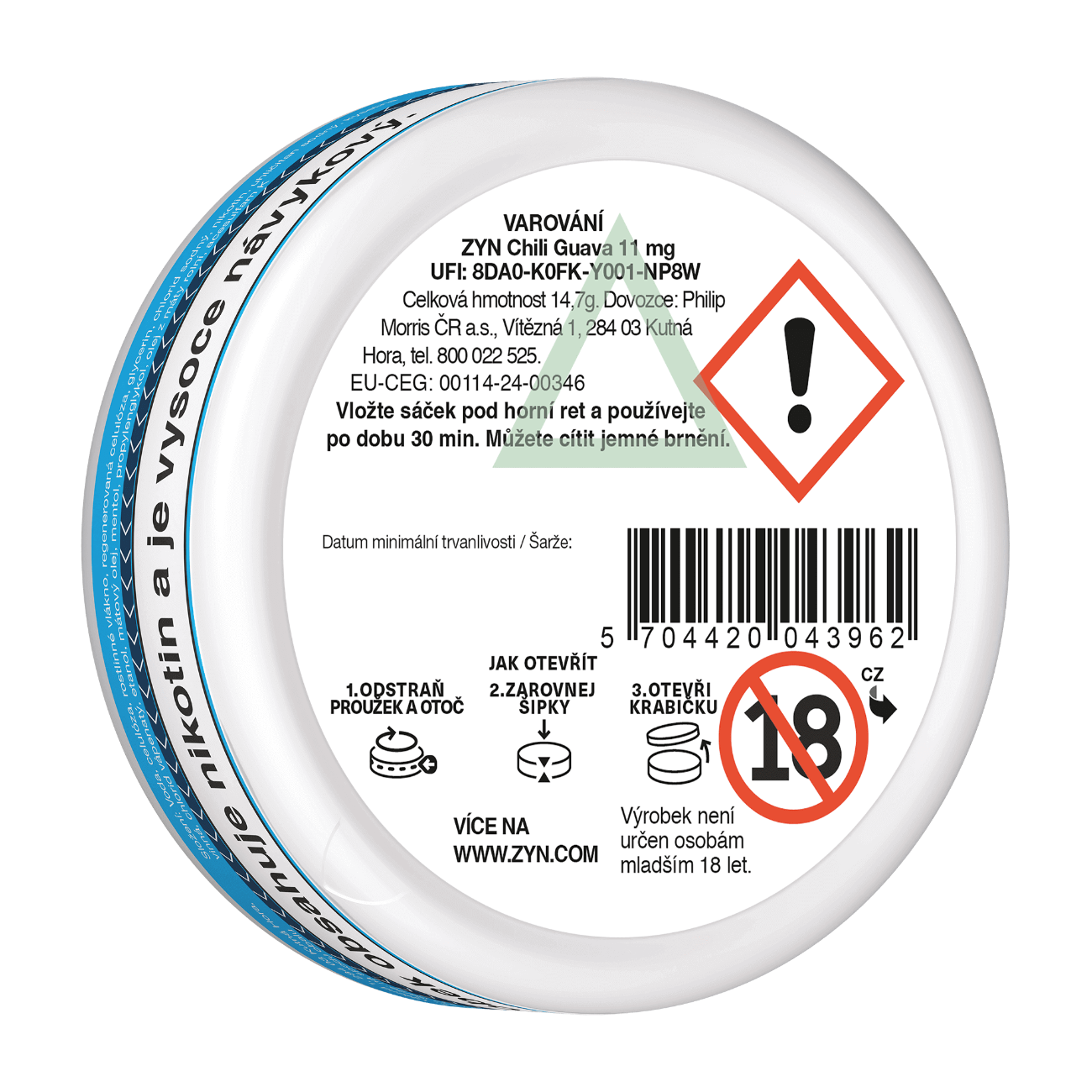 • UPOZORNĚNÍ Riziko podráždění: Nikotinové sáčky nežvýkejte a během použití buďte opatrní, abyste nikotinový sáček nepoškodili. Pokud zaznamenáte nepříjemné pocity nebo podráždění, jako například vředy v ústech, přestaňte nikotinové sáčky používat a v případě potřeby vyhledejte lékařskou pomoc. Po manipulaci s nikotinovými sáčky si před dotykem očí umyjte ruce. Při zasažení oči okamžitě vypláchněte vodou a v případě potřeby vyhledejte lékařskou pomoc.