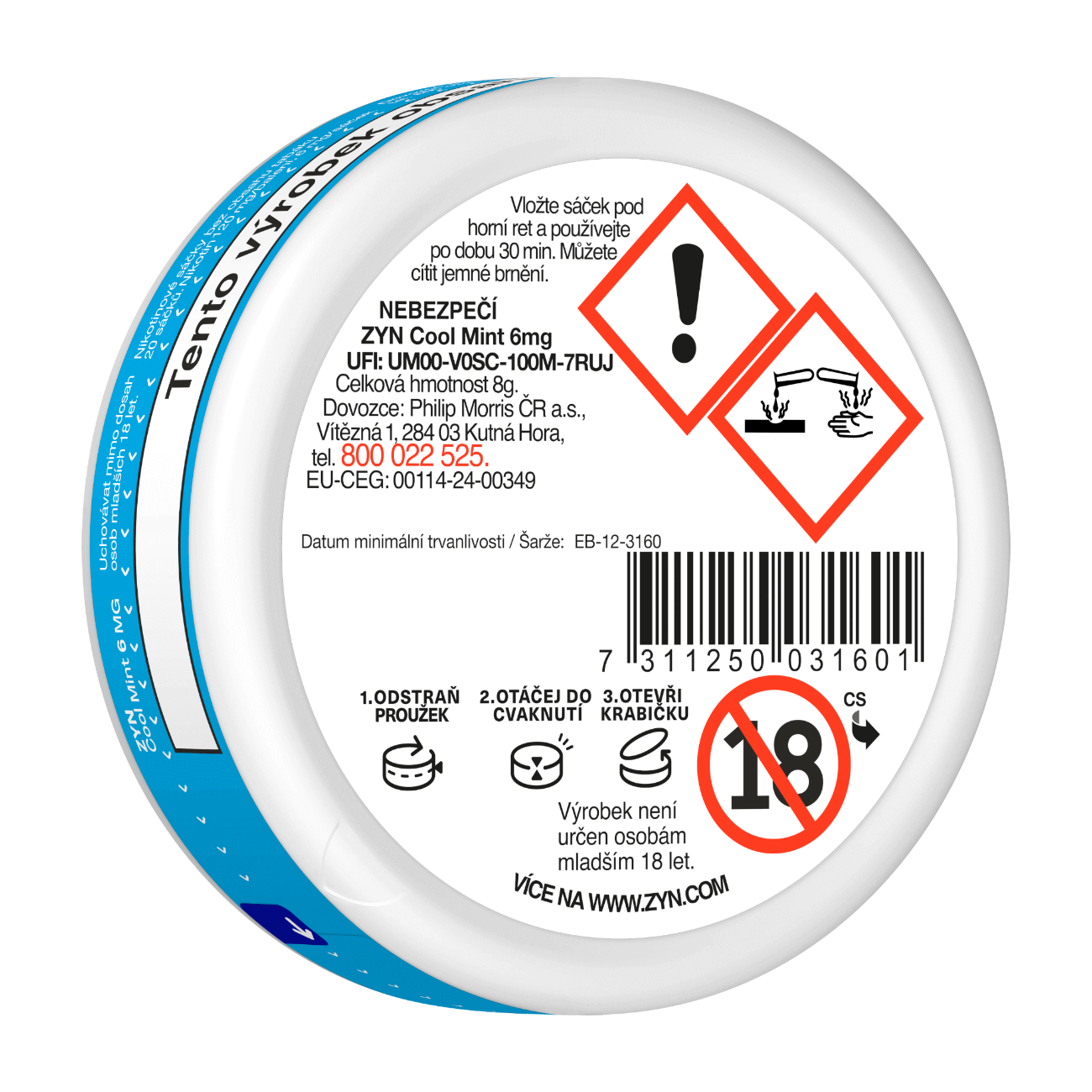 • UPOZORNĚNÍ Riziko podráždění: Nikotinové sáčky nežvýkejte a během použití buďte opatrní, abyste nikotinový sáček nepoškodili. Pokud zaznamenáte nepříjemné pocity nebo podráždění, jako například vředy v ústech, přestaňte nikotinové sáčky používat a v případě potřeby vyhledejte lékařskou pomoc. Po manipulaci s nikotinovými sáčky si před dotykem očí umyjte ruce. Při zasažení oči okamžitě vypláchněte vodou a v případě potřeby vyhledejte lékařskou pomoc.