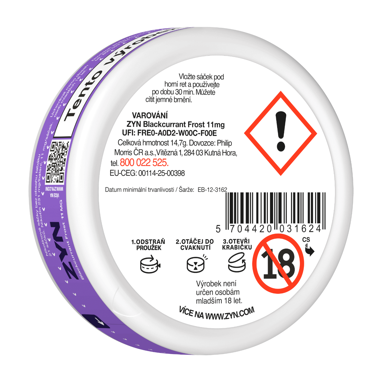 • UPOZORNĚNÍ Riziko podráždění: Nikotinové sáčky nežvýkejte a během použití buďte opatrní, abyste nikotinový sáček nepoškodili. Pokud zaznamenáte nepříjemné pocity nebo podráždění, jako například vředy v ústech, přestaňte nikotinové sáčky používat a v případě potřeby vyhledejte lékařskou pomoc. Po manipulaci s nikotinovými sáčky si před dotykem očí umyjte ruce. Při zasažení oči okamžitě vypláchněte vodou a v případě potřeby vyhledejte lékařskou pomoc.